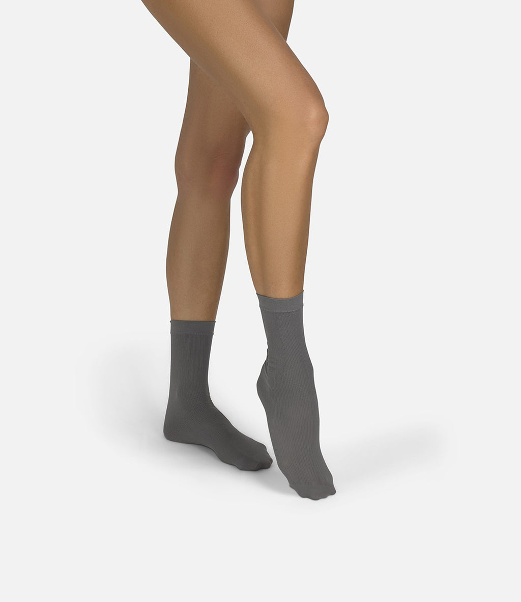 Meet the ribbed socks, die du in jedem Paar Boots tragen willst. Unsere 50 Denier Ribbed Socks bringen die gleiche raffinierte Textur und Weichheit wie unsere Tights und Overknees - nur als coole, knöchellange Version. Erhältlich in Grey, Brown, Off-White und Red verleihen sie jedem Winterlook einen subtilen Farbakzent und eine Portion Understatement.