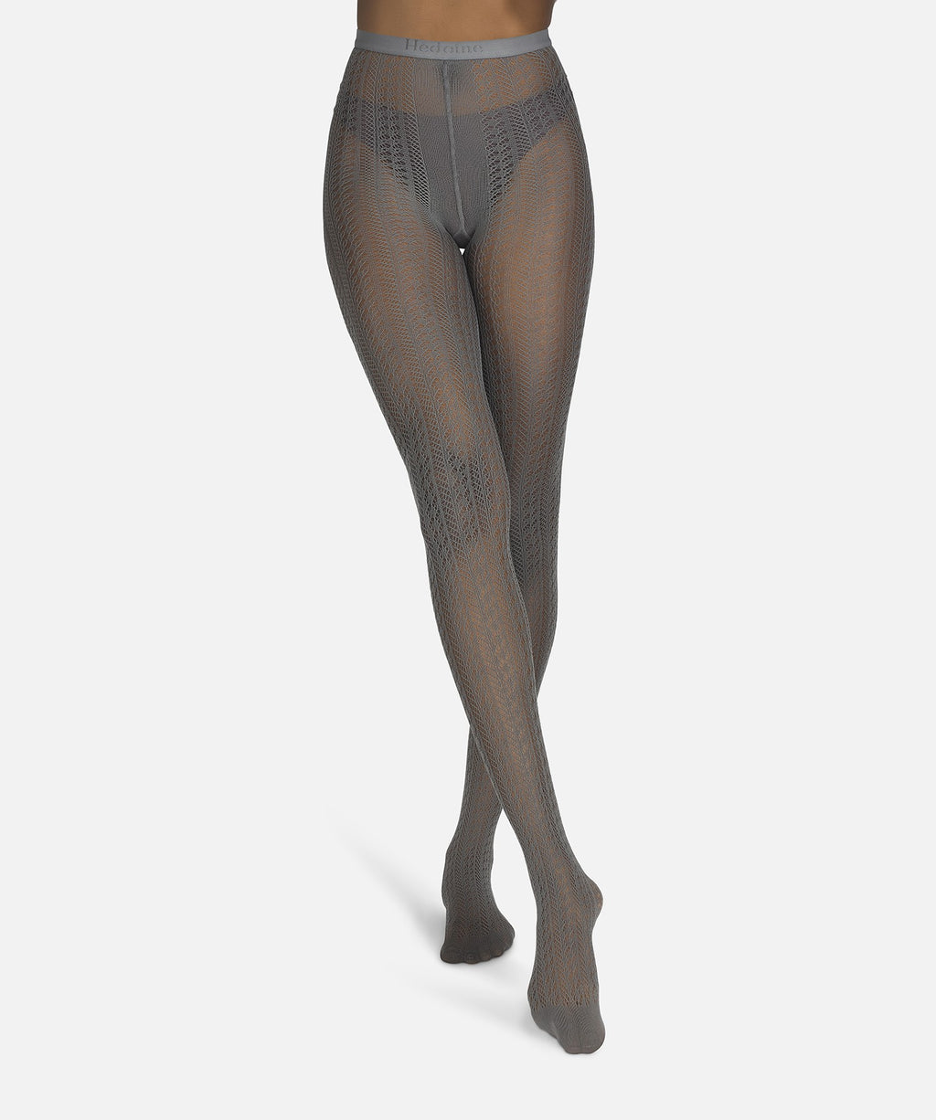 70 denier lace tights with a refined, geometric knit that adds depth and quiet drama to any outfit. Modern lace with no floral clichés. Made in Italy with ultra-fine yarns for a soft, smooth feel and a sculpted, elongated look.